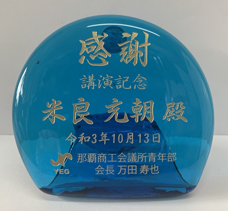 様々な用途に活用できる琉球ガラス盾はご希望の文字で名入れを行います。